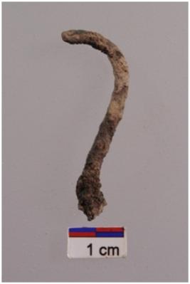 | Description / विवरण | A copper fish hook, carved, heavily rusted surface. |
