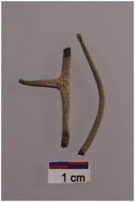 | Description / विवरण | Broken thin carved cooper fish hook, rusted surface. |