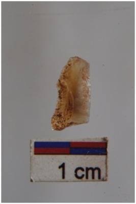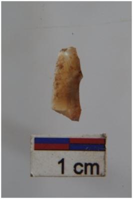 | Description / विवरण | Blade, prominent bulb with striking platform at proximal end, a ridge on dorsal surface, use-ware marks on both working edges. |