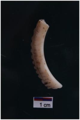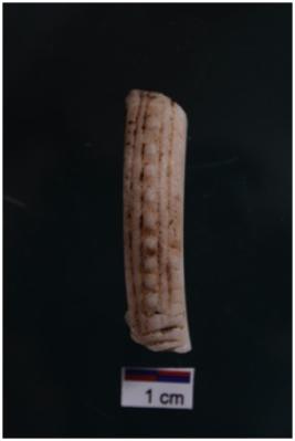 | Description / विवरण | Fragment of shell bangle, outer surface having a grove &marginal short vertical incisions at one edge only. |
