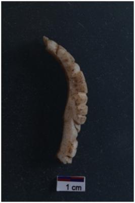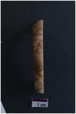 | Description / विवरण | Fragment of shell bangle, not circular on plan, outer surface having serrated margins & two grooves enclosing in between diamonds slantly cut, at one end a circular knob, incised to make a floral pattern & enclosed by groups of vertical lines. |
