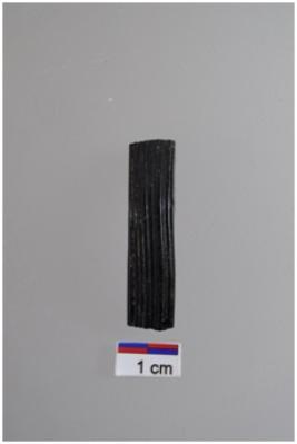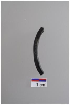| Description / विवरण | Fragment of a glass bangle, Plano convex section, black colour, plain lines in outer surface. |