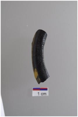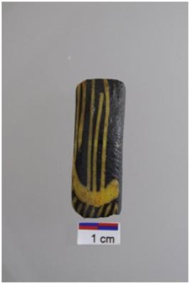 | Description / विवरण | Fragment of glass bangle, not circular in outline, plano convex section, straight yellow lines in green base&random designin lemon yellow. |