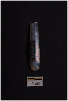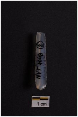 | Description / विवरण | Blade, parallel sided, prominent bulb with striking platform at proximal end, a ridge on dorsal surface, use-ware marks on both working edges. |