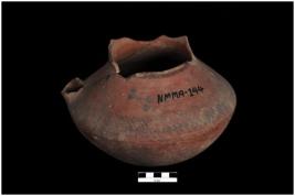 | Description / विवरण | A spouted jar with bulbous body, the tubular spout and rim portion is broken. It is painted o the outer surface with black pigment in the form of closely spaced oblique strikes. |
