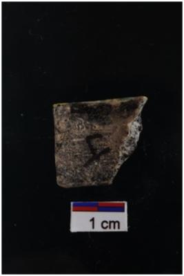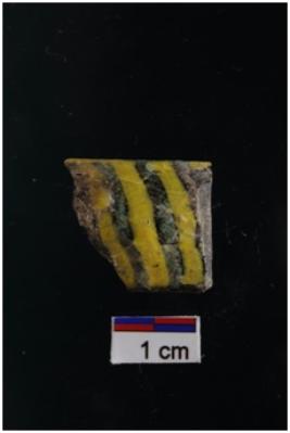 | Description / विवरण | Fragment of glass bangle, Plano convex section, slanting lemon yellow bands covered by hatched bands in green. |