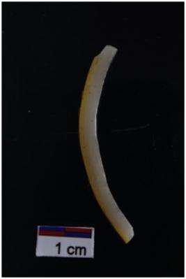 | Description / विवरण | Fragment of glass bangle, triangular section with rounded apex gamboz yellow base capped by a band of golden yellow covered by alternate pairs of dots. |