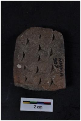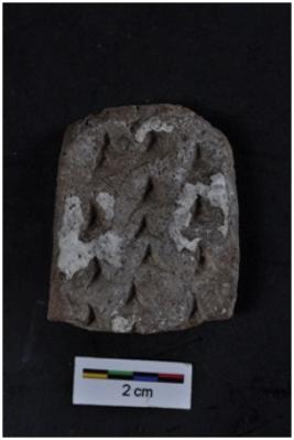 | Description / विवरण | Terracotta skin rubber, rectangular in shape, rough surface with incised markings. |
