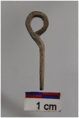 | Description / विवरण | Fragment of a copper object, probably a hook with one end coiled the rest of the rod flat in section, smooth surface. |