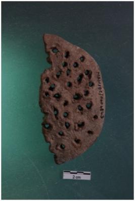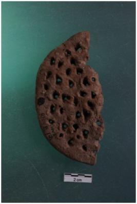 | Description / विवरण | A terracotta object of a half of a cake, perforated by means of a straw piece as the marks on the section shown red in colour medium coarse fabric, well fired. |