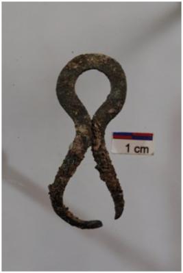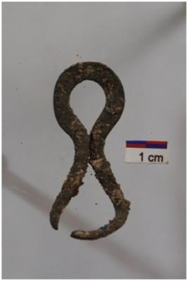 | Description / विवरण | 8 shape copper object, broken on the upper part, it is made of thin horizontal sheet of copper probably used as a decorative piece for hair, rusted surface. |