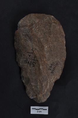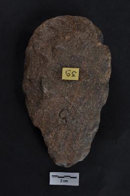 | Description / विवरण | Quartzite Handaxe, bi-facial, long pear shaped, retouches along the periphery. |