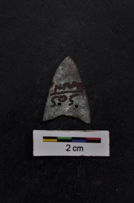 | Description / विवरण | Have a concave crescent base with two parallel perforations near the base, weathered surface. |