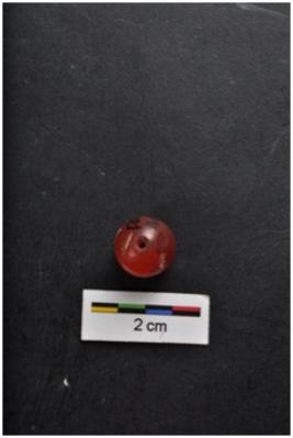 | Description / विवरण | Carnelian bead, globular shape, with perforation, smooth polished surface. |