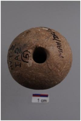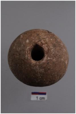 | Description / विवरण | A stone bead, barrel shape outline with center perforation, red in colour. |