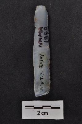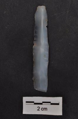 | Description / विवरण | Blade, prominent bulb with prepare striking platform at proximal end, slightly broken distal end, a ridge on dorsal surface, retouches on both working edge. |