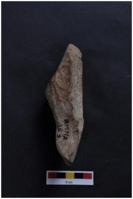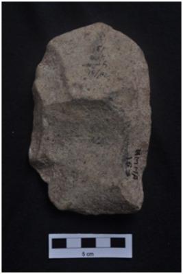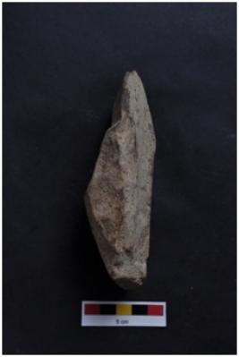 | Description / विवरण | Cleaver long with straight cutting edge, pointed U-Shaped butt, flake scars visible on surface. |