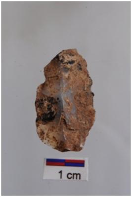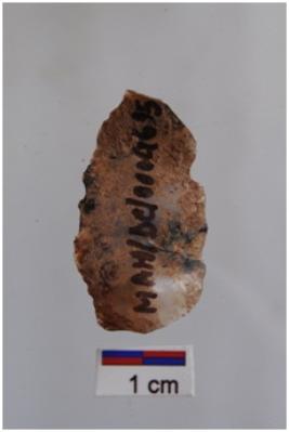 | Description / विवरण | Blade with convex sides, prominent bulb with striking platform at proximal end, a ridge on dorsal surface, use-ware marks on both working edges. |