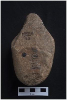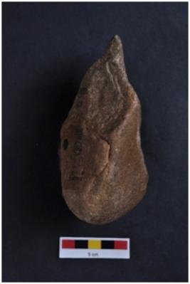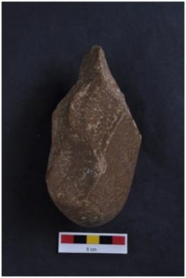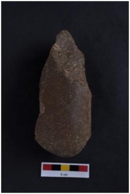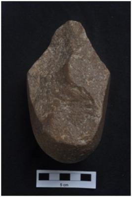 | Description / विवरण | Handaxe made on pebble, round butt end, another pointed end, cortex visible. |
