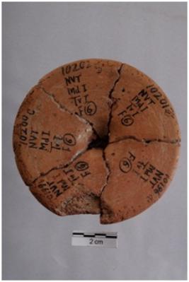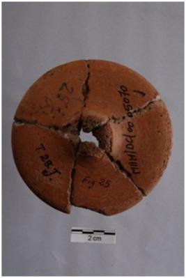 | Description / विवरण | A Terracotta knobbed wheel, Plano convex shape, red in colour, fine fabric, well fired. |