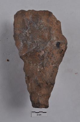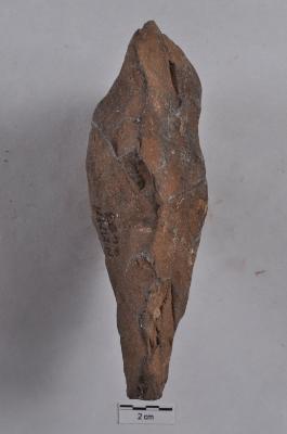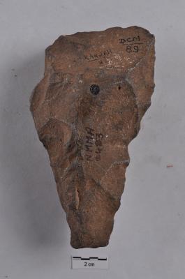 | Description / विवरण | Handaxe, long pointed, roughly triangular in shape, bi-facial, alternate flaking along the periphery. |