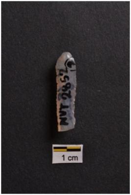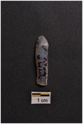 | Description / विवरण | Blade, parallel sided, prominent bulb with striking platform at proximal end, use-ware marks on both working edges. |