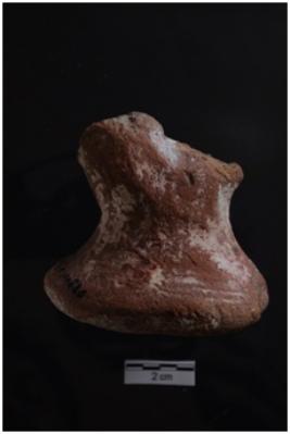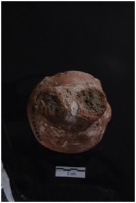 | Description / विवरण | A terracotta object of lid truncated knob for hording complete specimen with hold broken.Lime coated, painted with red ochre, well fired, fine fabric |