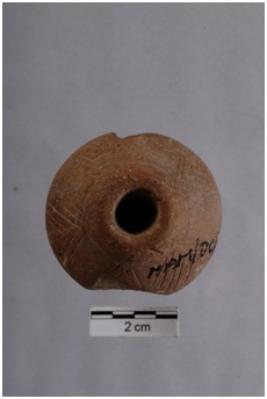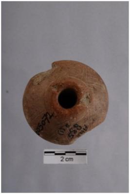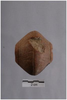 | Description / विवरण | Bead with biconical outline shape. Red in colour, fine fabric, well fired, groove on the top & end. |