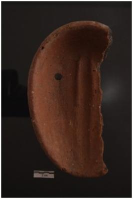 | Description / विवरण | A terracottafragment of a lampwith the side depressed near the wick end, medium coarse fabric, red in colour, well fired. |
