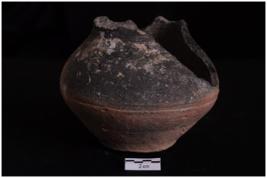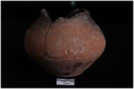 | Description / विवरण | A terracotta object of almost complete specimen of pot with flat base, convex sides, rim broken, interior dull black grove at the belly, medium coarse fabric and well fired. |