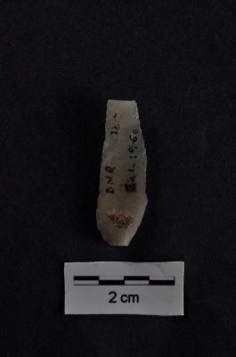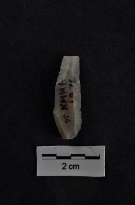 | Description / विवरण | Blade, with one straight and another convex working edge, prominent bulb with prepare striking platform at proximal end, slightly broken distal end, a ridge on dorsal surface, use-wear marks on both working edges. |