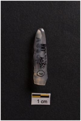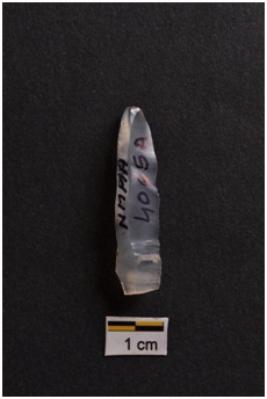 | Description / विवरण | Blade, prominent bulb with striking platform at proximal end, a ridge on dorsal surface, use-ware marks on both working edges. |