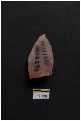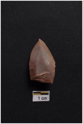 | Description / विवरण | Utilized Flake, use-ware marks on edges, three ridges on dorsal surface forming a triangle. |