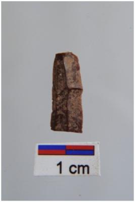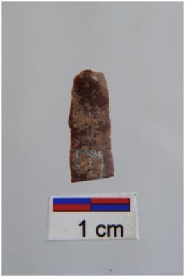 | Description / विवरण | Blade, parallel sided, prominent bulb with striking platform at proximal end, a ridge on dorsal surface, use-ware marks on both working edges. |