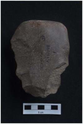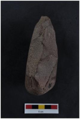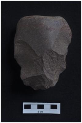 | Description / विवरण | Chopper, pear shaped, made on pebble, cortex visible, bifacial. |