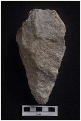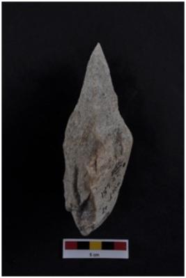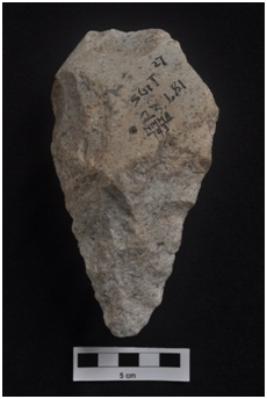 | Description / विवरण | Elongated pear shaped Handaxe, pointed end, alternate flaking along the periphery. |