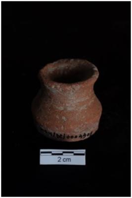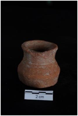 | Description / विवरण | A complete miniature pot of Red ware. Ghat shape out line, carinated body, flat base, coarse fabric,wheel made, well fired. |