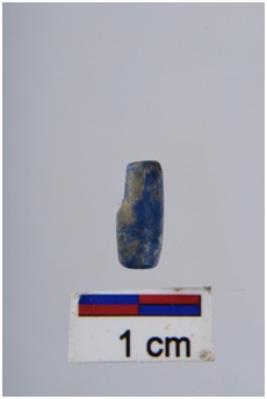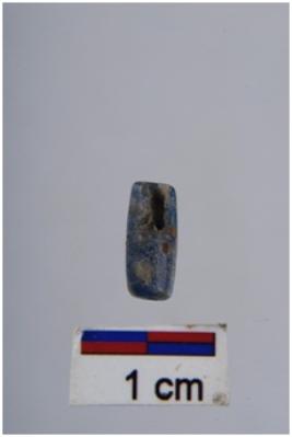 | Description / विवरण | Bead with long barrel outline shape, blue & green colour. |