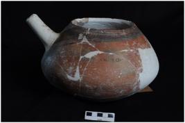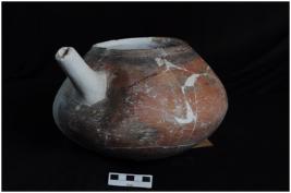 | Description / विवरण | A complete specimen of spouted pot with squat globular body & close mouth.Surface having red slip on the entire paintings in horizontal blames & vertical bond design. |