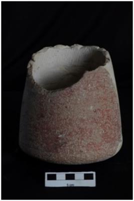 | Description / विवरण | Remodeled with a round base, broken from top.Could be a vase. Convex rounded base, red colour, well fired. |