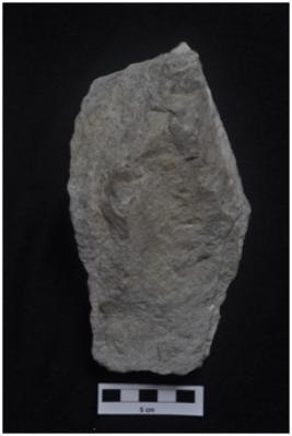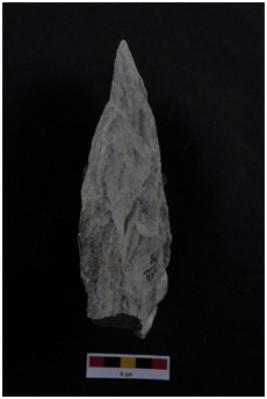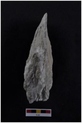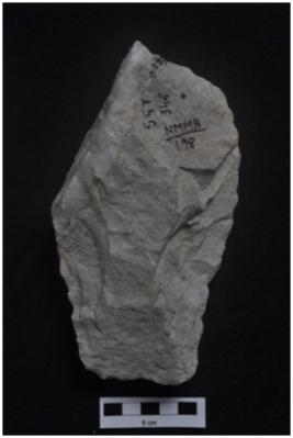 | Description / विवरण | Cleaver, side struck, long body, narrow straight cutting edge, retouches along the periphery. |