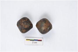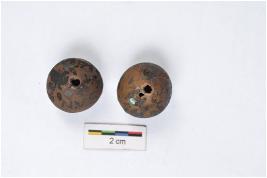 | Description / विवरण | Two biconical beads with perforation, weathered surface with encrustation marks. |