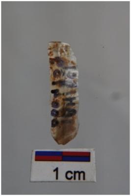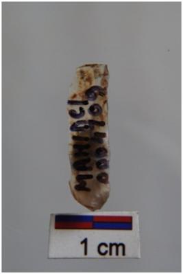 | Description / विवरण | Blade, parallel sided, diffused bulb with striking platform at proximal end, a ridge on dorsal surface, use-ware marks on both working edges. |