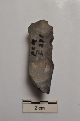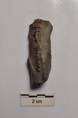 | Description / विवरण | Blade, diffused bulb with striking platform at proximal end, use-ware marks on both working edges, with mid-ridge. |