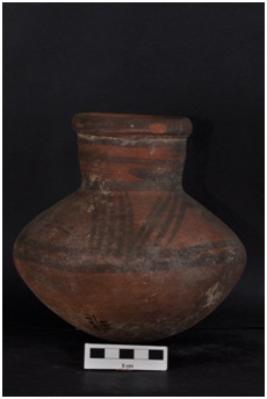 | Description / विवरण | A squat shaped jar with a high neck & rounded rim. It is painted on the outer surface in the form of oblique strokes and horizontal bands. |