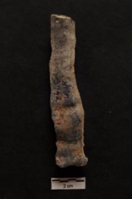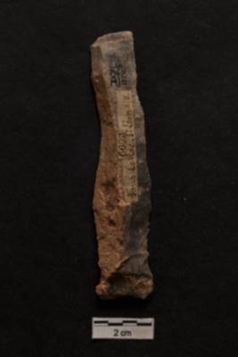 | Description / विवरण | Blade, long diffused bulb with striking platform at proximal end, a ridge on dorsal surface, use-ware marks on both working edges. |