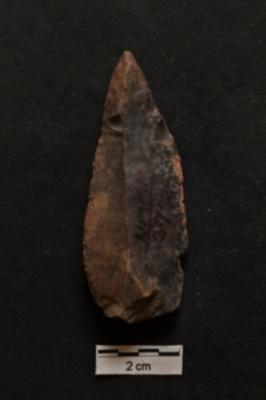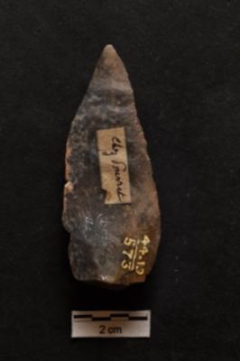 | Description / विवरण | Blade cum point, pointed distal end, diffused bulb with striking platform at proximal end, a ridge on dorsal surface, use-ware marks on both working edges |