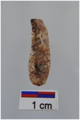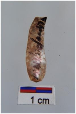 | Description / विवरण | Blade, prominent bulb with striking platform at proximal end, pointed distal end, use-ware marks on both working edges. |