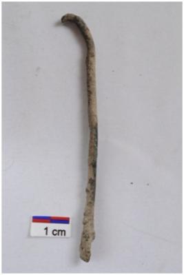 | Description / विवरण | A copper hook.One end in broken and other end is pinched tapered,circular in cross section heavily rusted. |