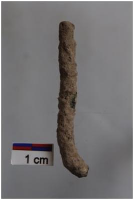 | Description / विवरण | A copper object of hook, both ends are broken, circular rounded shape, heavily rusted surface. |